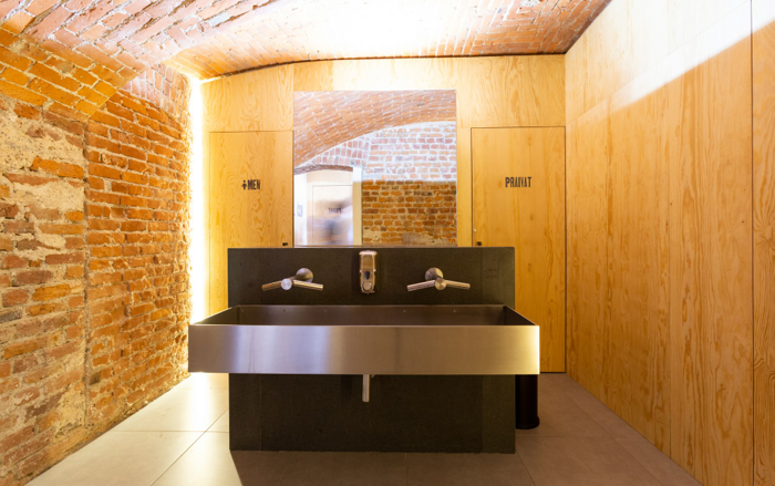 Alla semplicità della cucina corrisponde una sobrietà dell’architettura fondata sulla razionale distribuzione di ambienti il cui decoro è affidato esclusivamente al cibo e alla matericità dell'allestimento. Trasponendo l’importanza della materia prima in cucina anche all’architettura, per gli arredi fissi e l’involucro interno sono utilizzati solo materiali locali tradizionali (pietra, cotto di fattura artigianale) e industriali (compensato marino, acciaio grezzo), sempre al naturale, privilegiando l’onestà costruttiva. Secondo lo stesso principio, le caratteristiche strutturali degli ambienti preesistenti (muri, soffitto, pavimento) sono messe a nudo, trascurando volutamente di celarne la materia con le ordinarie rifiniture; al calore della luce e alla presenza conviviale della gente, infine, è affidato il ruolo di animare l’atmosfera e di conferire unitarietà all’ambiente.